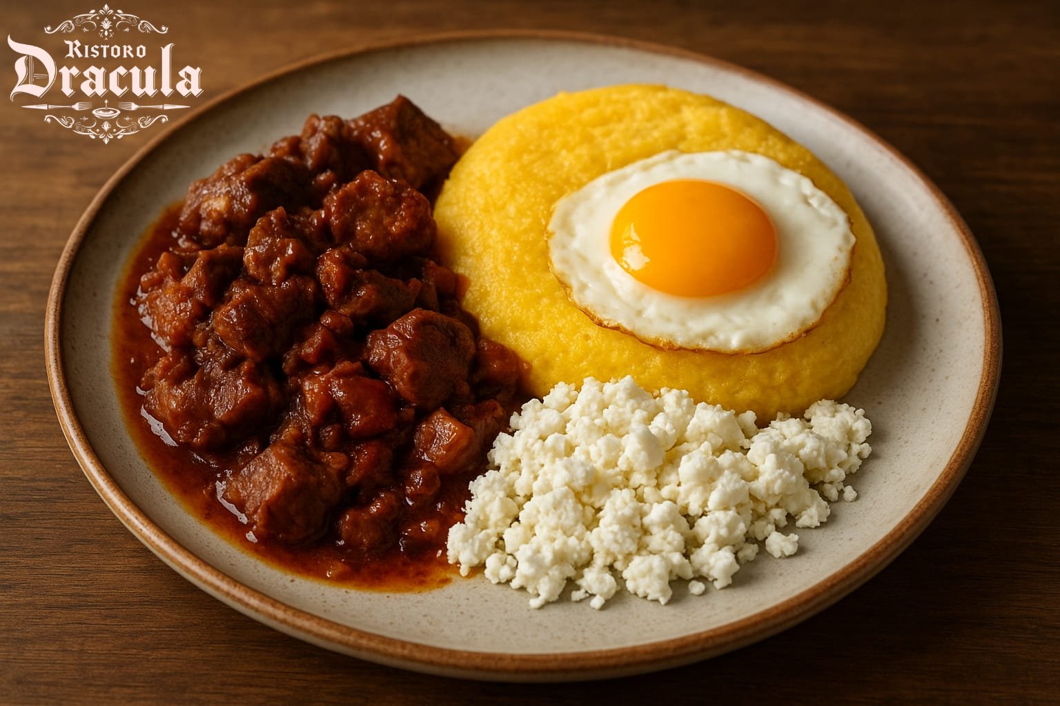 Stufato di carni con polenta , formaggio e uova